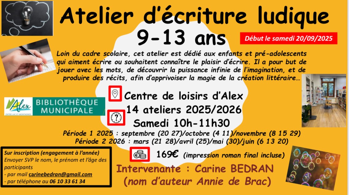 Loin du cadre scolaire, cet atelier ludique est dédié à ceux qui aiment écrire ou qui ont envie de connaître le plaisir d’écrire. Il a pour but de jouer avec les mots, de découvrir la puissance infinie de l’imagination, et de produire des récits afin d’apprivoiser la magie de la création littéraire ! Enfants de 9 à 13 ans.